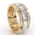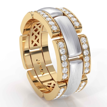 Modern chain link men's diamond eternity wedding band made from high quality 18k Gold 2Tone. This handsome wedding ring features polished finished center in white gold and diamonds in a micro pave setting beautifully set on yellow gold edges. Available in 14k & 18k white gold, yellow gold, rose gold and platinum 950. (0.75Ct. tw.)