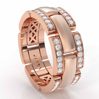 Modern chain link men's diamond eternity wedding band made from high quality 14k Rose Gold. This handsome wedding ring features polished finished center in white gold and diamonds in a micro pave setting beautifully set on yellow gold edges. Available in 14k & 18k white gold, yellow gold, rose gold and platinum 950. (0.75Ct. tw.)