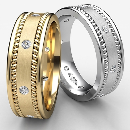 This classic wedding ring for him is durable and comfort fit. Available in 14k & 18k 2 tone gold.