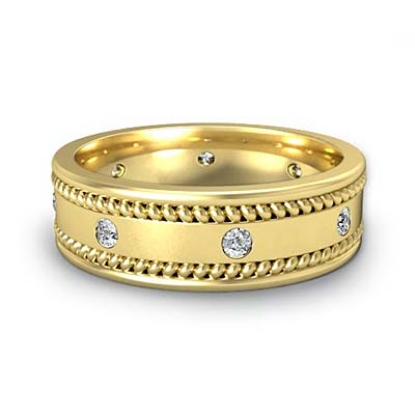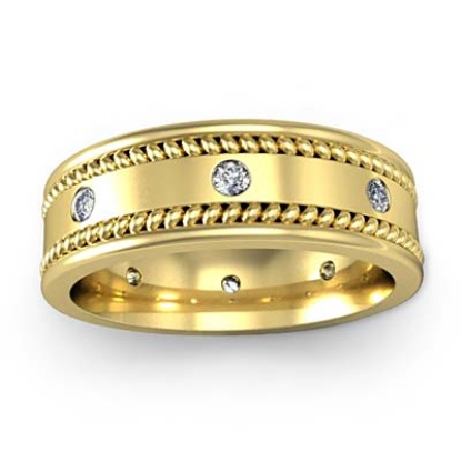 This modern diamond eternity men's wedding band crafted in 14k Gold Yellow. Featuring highly polished rope edges in yellow gold with round diamonds set in a bezel setting.