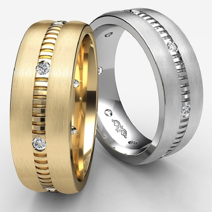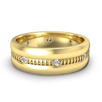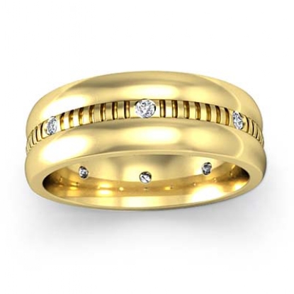 This stunning men's diamond eternity wedding band is made from 18k Gold Yellow. The timeless gold ring features white gold dome edges and vertical cuts in yellow gold with round diamonds set in a bezel setting. Available in 14k & 18k 2 tone gold. (0.16Ct. tw.)