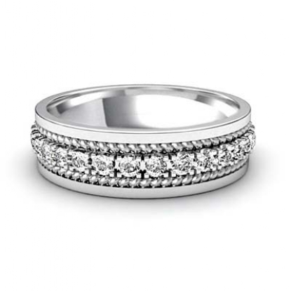 Unique double rope men's diamond eternity flat edge wedding band is made from 14k Gold White. Showcasing white gold flat edge and yellow gold double rope and center with round diamonds in a prong setting.