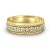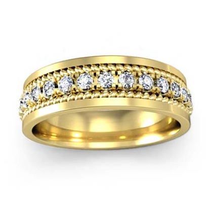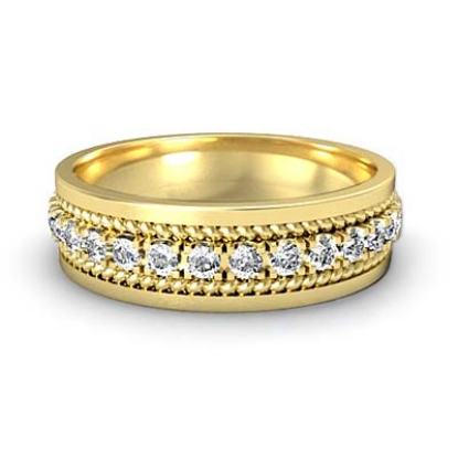 Unique double rope men's diamond eternity flat edge wedding band is made from 14k Gold Yellow. Showcasing white gold flat edge and yellow gold double rope and center with round diamonds in a prong setting.