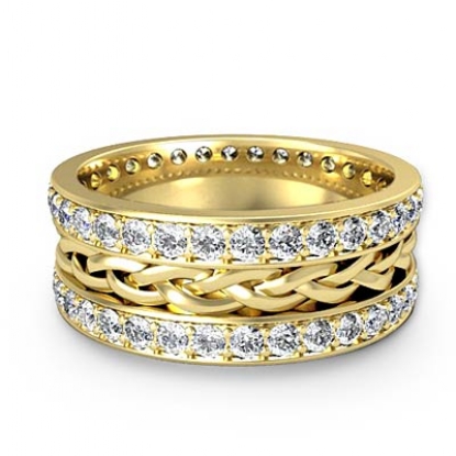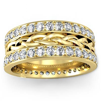 A handmade braided design men's diamond eternity wedding band is made from 18k Gold Yellow. Featuring yellow gold braided design in the center and pave set round diamonds beautifully set with white gold.