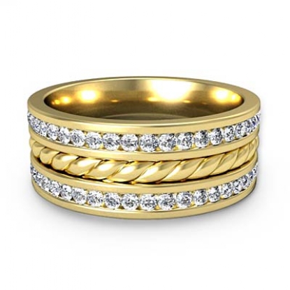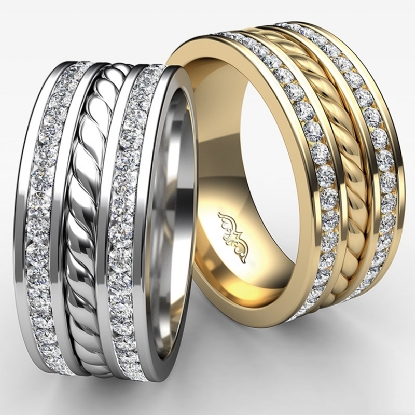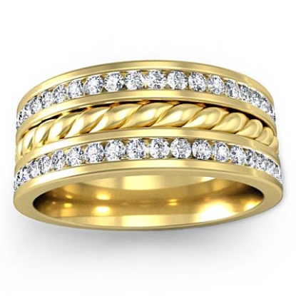 This handmade rope design men's diamond eternity wedding band is made from 14k Gold Yellow. Featuring yellow gold rope design in center and round diamonds in a channel setting.