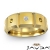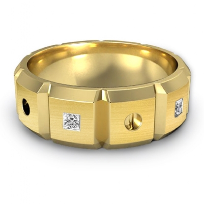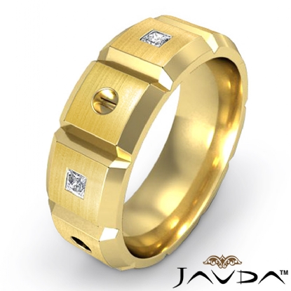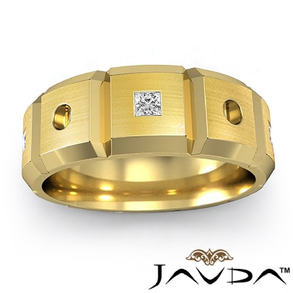 This unique and stunning diamond eternity men's wedding band is made from 14k Gold Yellow. Showcasing polished beveled edges and matte finish center with 5 princess cut diamonds set in a bezel setting.