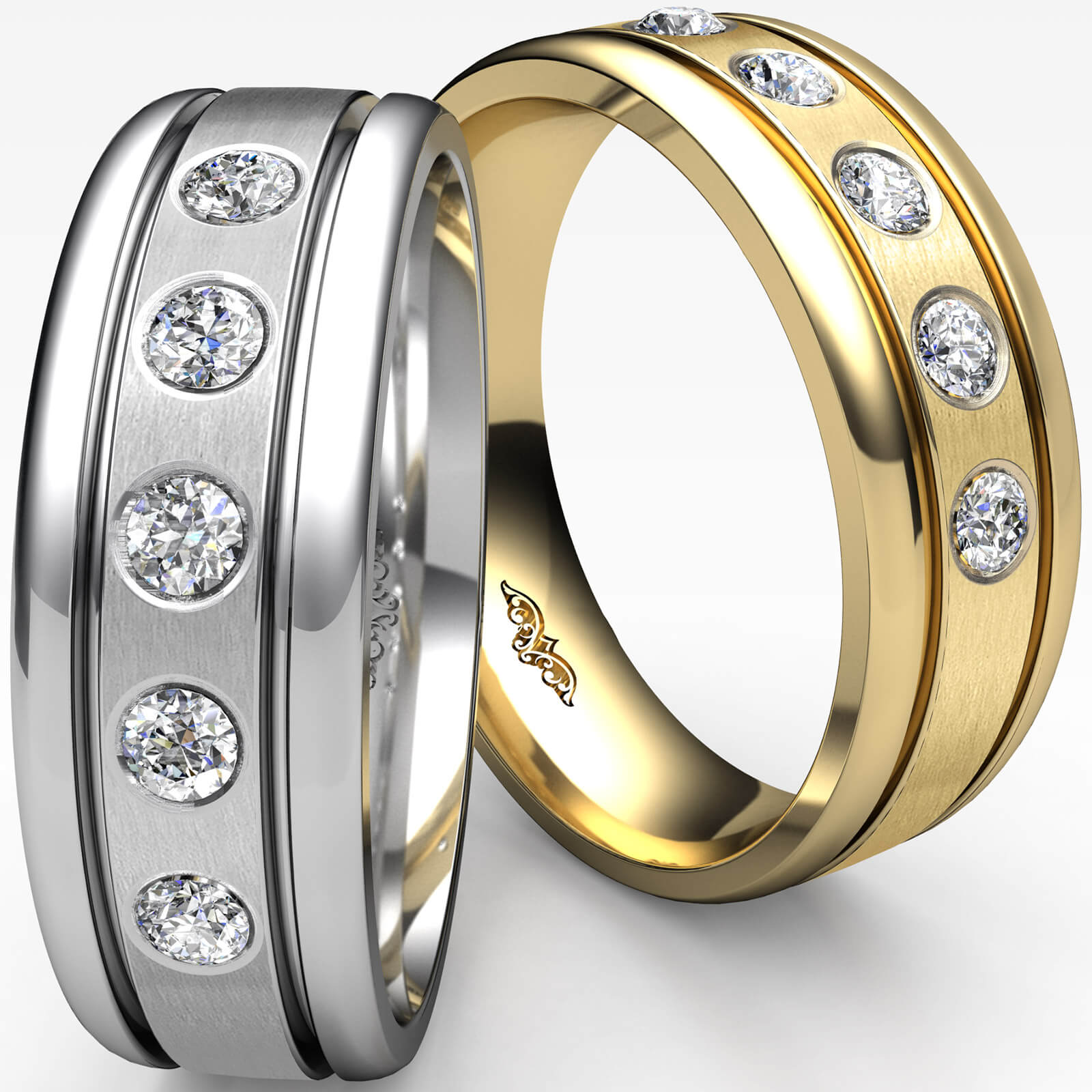 This classic diamond men's half wedding band is made from solid 14k Gold White. Featuring yellow gold polished finish edges and white gold matte finish center with parallel grooves round diamonds beautifully set in a bezel setting.