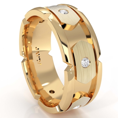 The attractive men's diamond eternity wedding band is made from solid 18k Gold Yellow. This 2 tone ring features polished finished with round diamond set in a bezel setting.