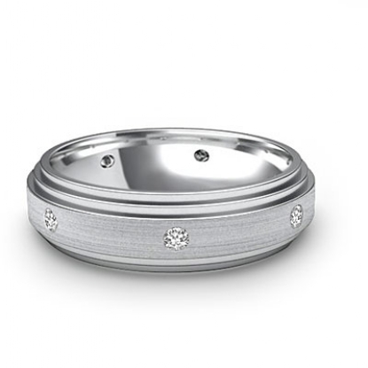 The brushed finish diamond eternity men's wedding band crafted in 14k Gold White. This ring features polished step edges in yellow gold and brushed finish center in white gold with round cut diamonds in a bezel setting.