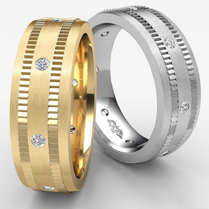 This matte finish diamond eternity men's wedding band crafted in 14k Gold White. Featuring polished ribbed edges in yellow gold and center matte finished in white gold with round cut diamonds in a bezel set.