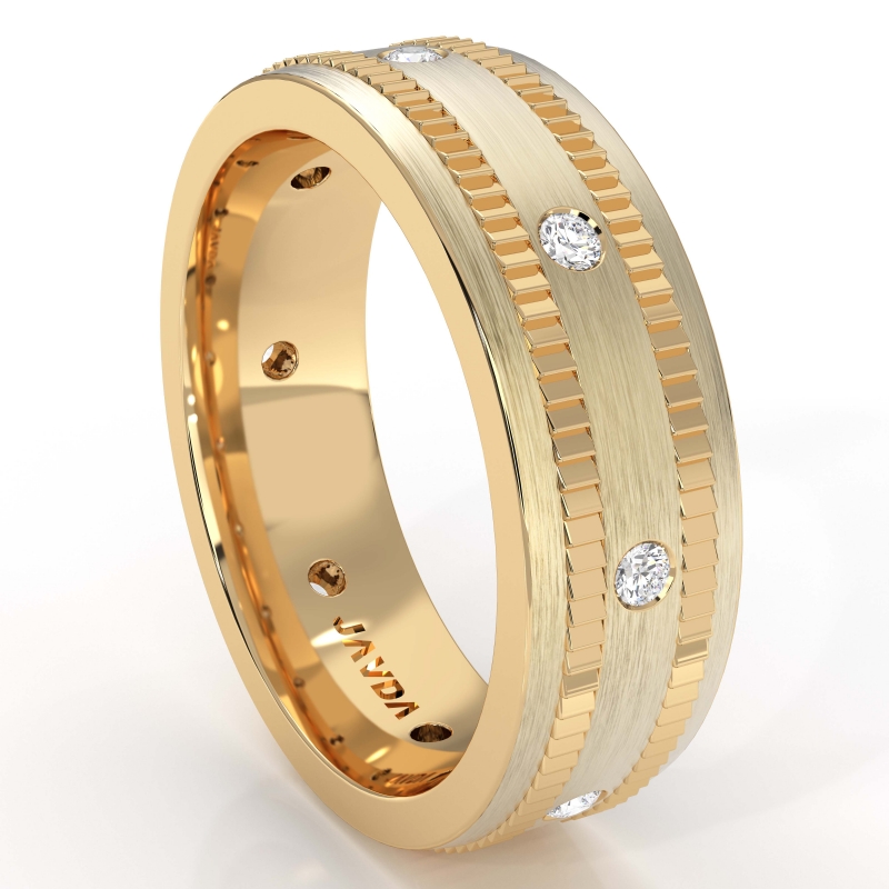 This matte finish diamond eternity men's wedding band crafted in 14k Gold Yellow. Featuring polished ribbed edges in yellow gold and center matte finished in white gold with round cut diamonds in a bezel set.