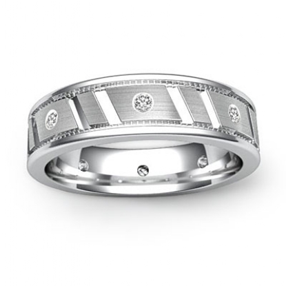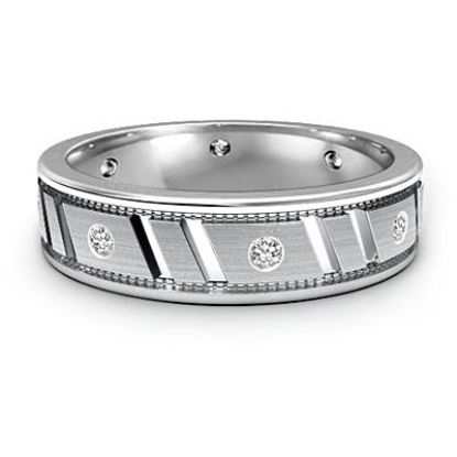 Simple and traditional, this men's diamond eternity wedding band made from 14k Gold White. Featuring polished finish round edges in yellow gold and brushed finish center in white gold with vertical cut grooves and round diamonds in a bezel set.