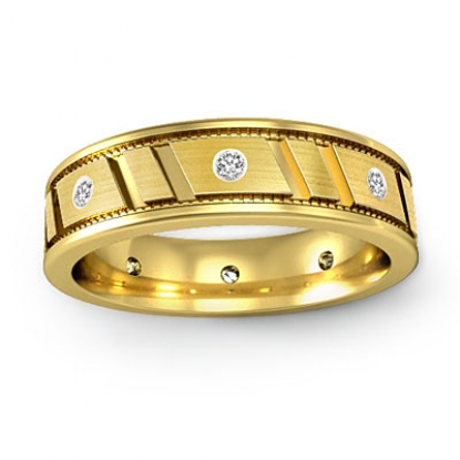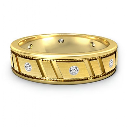 Simple and traditional, this men's diamond eternity wedding band made from 18k Gold Yellow. Featuring polished finish round edges in yellow gold and brushed finish center in white gold with vertical cut grooves and round diamonds in a bezel set.