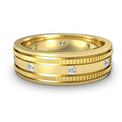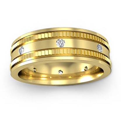 The luxurious men's diamond eternity wedding band crafted in 14k Gold Yellow. Featuring polished center with round cut diamonds in a bezel set and the edges in yellow gold that give the ring a sophisticated designer look.