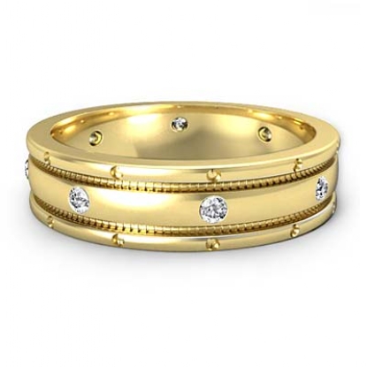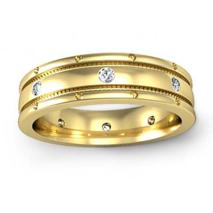A bold and handsome design men's diamond eternity wedding band crafted in 18k Gold Yellow. This wedding ring features yellow gold polished edges and white gold center dome with round cut diamonds in a bezel set.
