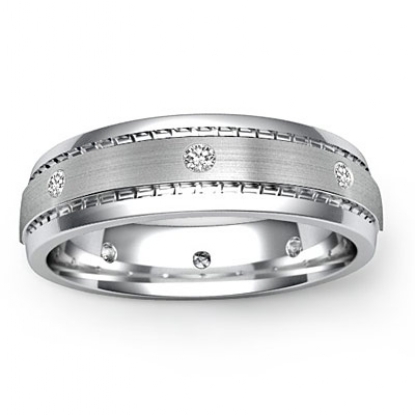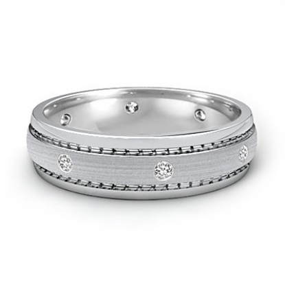 The solid men's diamond eternity wedding band made from 14k Gold White. This wedding ring features yellow gold polished edges and matte finish white gold center with round cut diamonds in a bezel set.