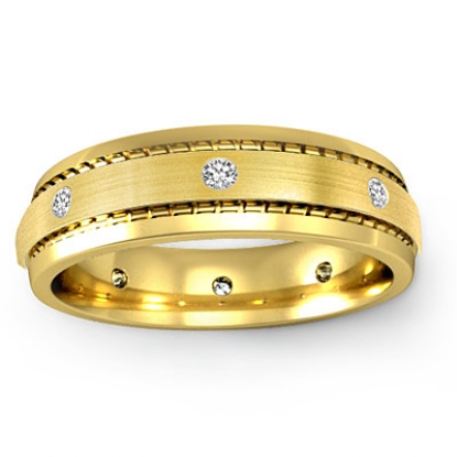 The solid men's diamond eternity wedding band made from 18k Gold Yellow. This wedding ring features yellow gold polished edges and matte finish white gold center with round cut diamonds in a bezel set.