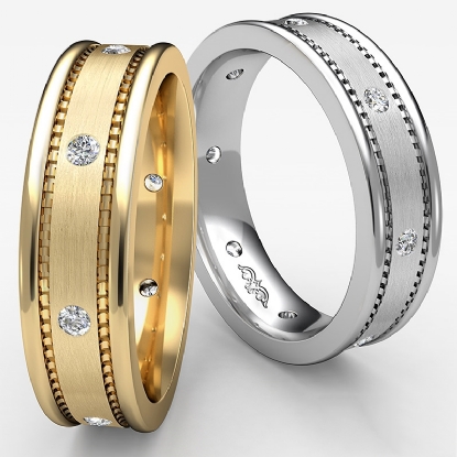Modern and contemporary style men's diamond eternity wedding band made from solid 14k Gold White. This ring features brushed finish white gold center and yellow gold round edges with round cut diamonds in a bezel setting.