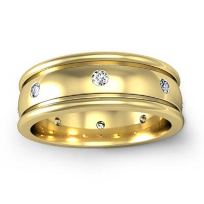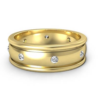A classic style of men's diamond eternity wedding band is crafted in 14k Gold Yellow. Featuring polished finish yellow gold round edges and white gold dome center with round cut diamonds in a bezel setting.