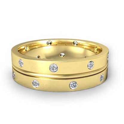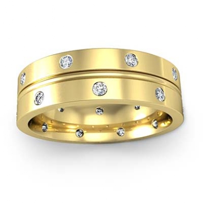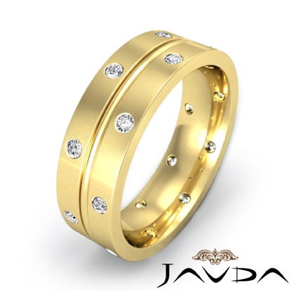 The polished finished diamond eternity men's wedding band is made from 18k Gold Yellow. This solid wedding ring features center thin line in yellow gold and round diamonds set in a bezel setting. This 6mm ring is comfort fit and available in 14k & 18k 2 tone gold. (0.35Ct. tw.)