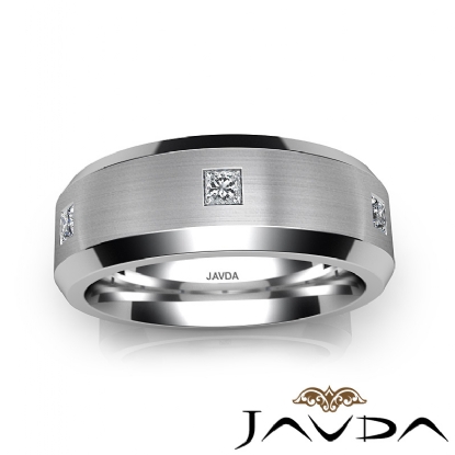 Classic matte finish men's diamond eternity wedding band is made from Platinum 950. Showcasing polished beveled edge and matte finished center with 6 princess cut diamonds in a bezel setting.