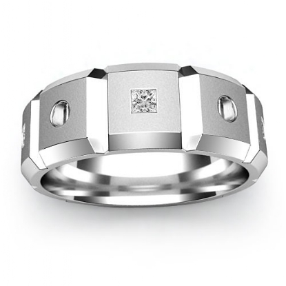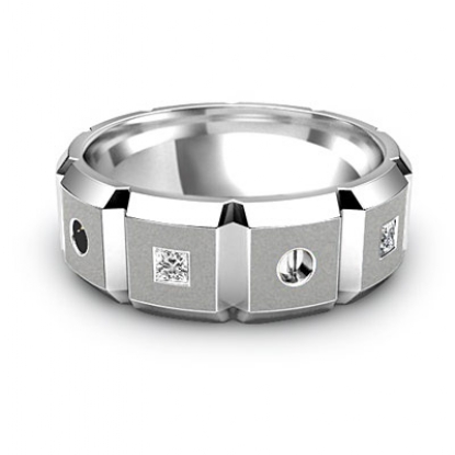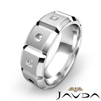 This unique and stunning diamond eternity men's wedding band is made from Platinum 950. Showcasing polished beveled edges and matte finish center with 5 princess cut diamonds set in a bezel setting.