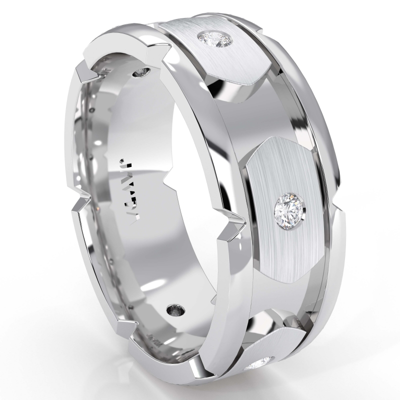 The attractive men's diamond eternity wedding band is made from solid Platinum 950. This 2 tone ring features polished finished with round diamond set in a bezel setting.