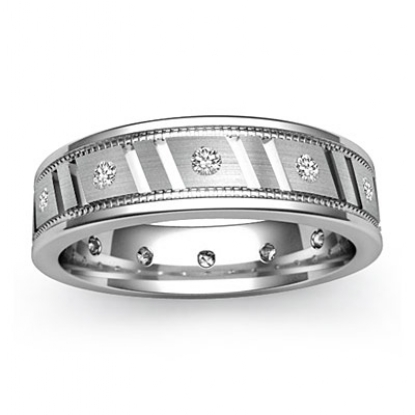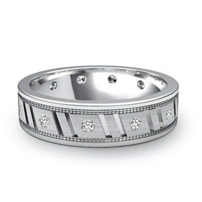 This handsome comfort fit men's diamond carved eternity wedding band made from Platinum 950. Featuring parallel vertical groove and milgrain edges with round diamond in a bezel setting.