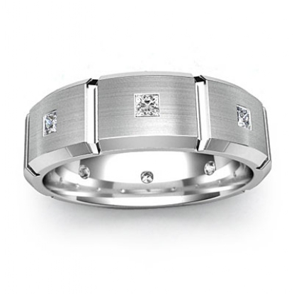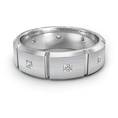 This comfort fit diamond eternity men's wedding band made from Platinum 950. Featuring matte finished center with vertical cuts and polished beveled edges.