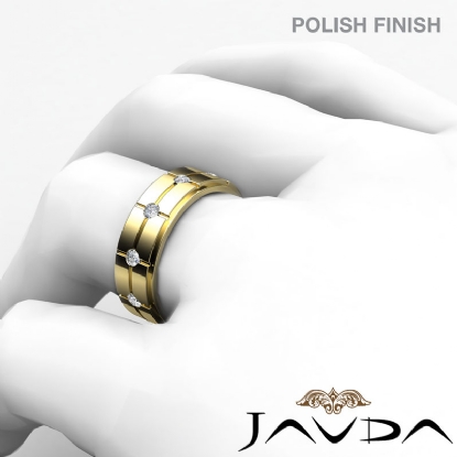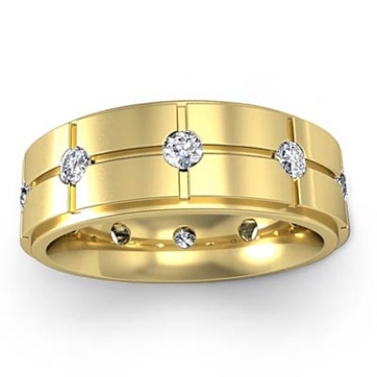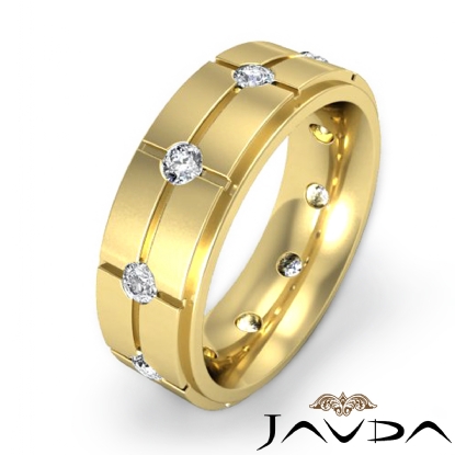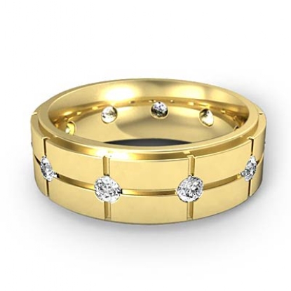 This unique polished finish cross grooved round diamond eternity men's wedding band is crafted in solid 14k Gold Yellow. Featuring polished finish vertical & horizontal grooves with round diamonds set in a bezel setting.