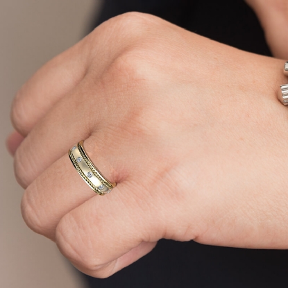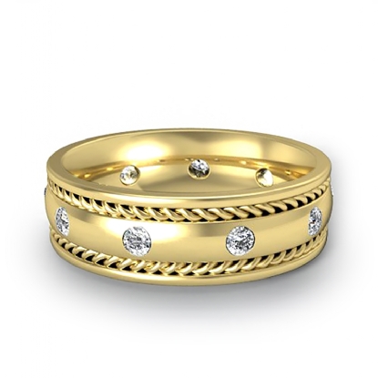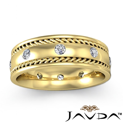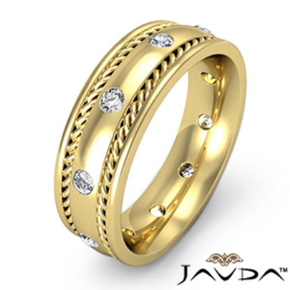 An elegant and stylish rope edge men's diamond eternity wedding band is made from 14k Gold Yellow. This ring features polished finish rope edge and center dome with round diamonds in a bezel setting, rope detailing gives it a stylish look.