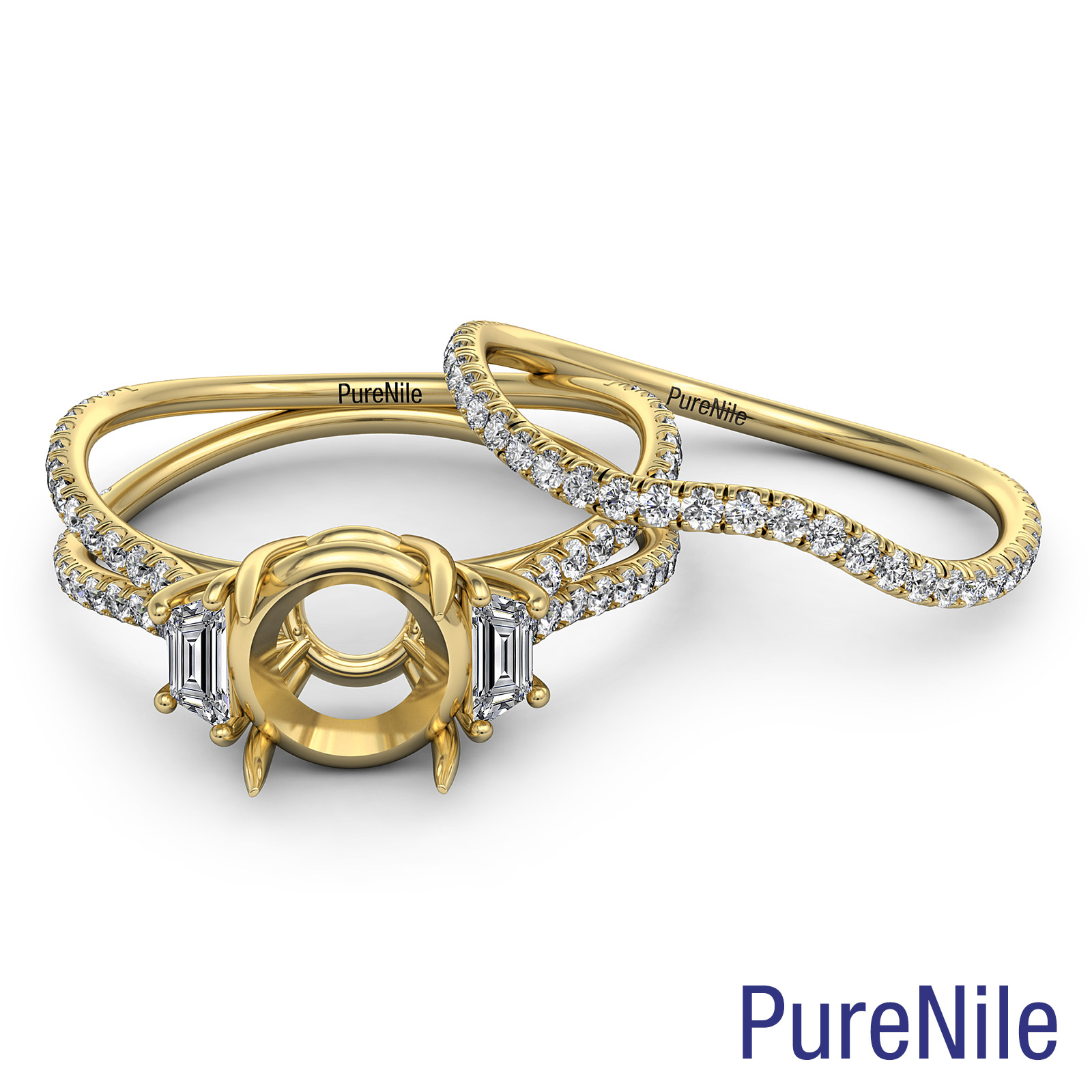 Stunning and unique three stone round semi mount bridal set diamond engagement ring expertly handcrafted in quality 18k Gold Yellow. Features a beautiful split shank and wedding band with diamonds in a french U split pave and