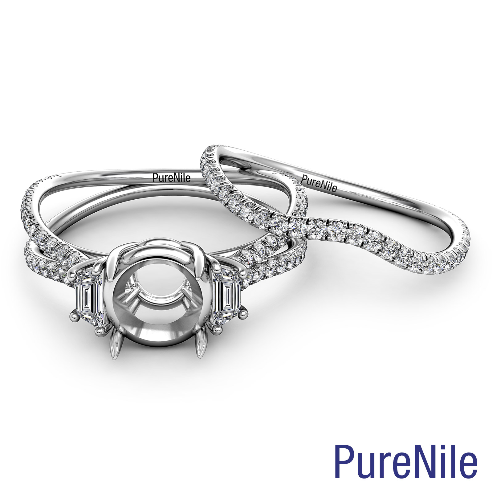 Stunning and unique three stone round semi mount bridal set diamond engagement ring expertly handcrafted in quality Platinum 950. Features a beautiful split shank and wedding band with diamonds in a french U split pave and