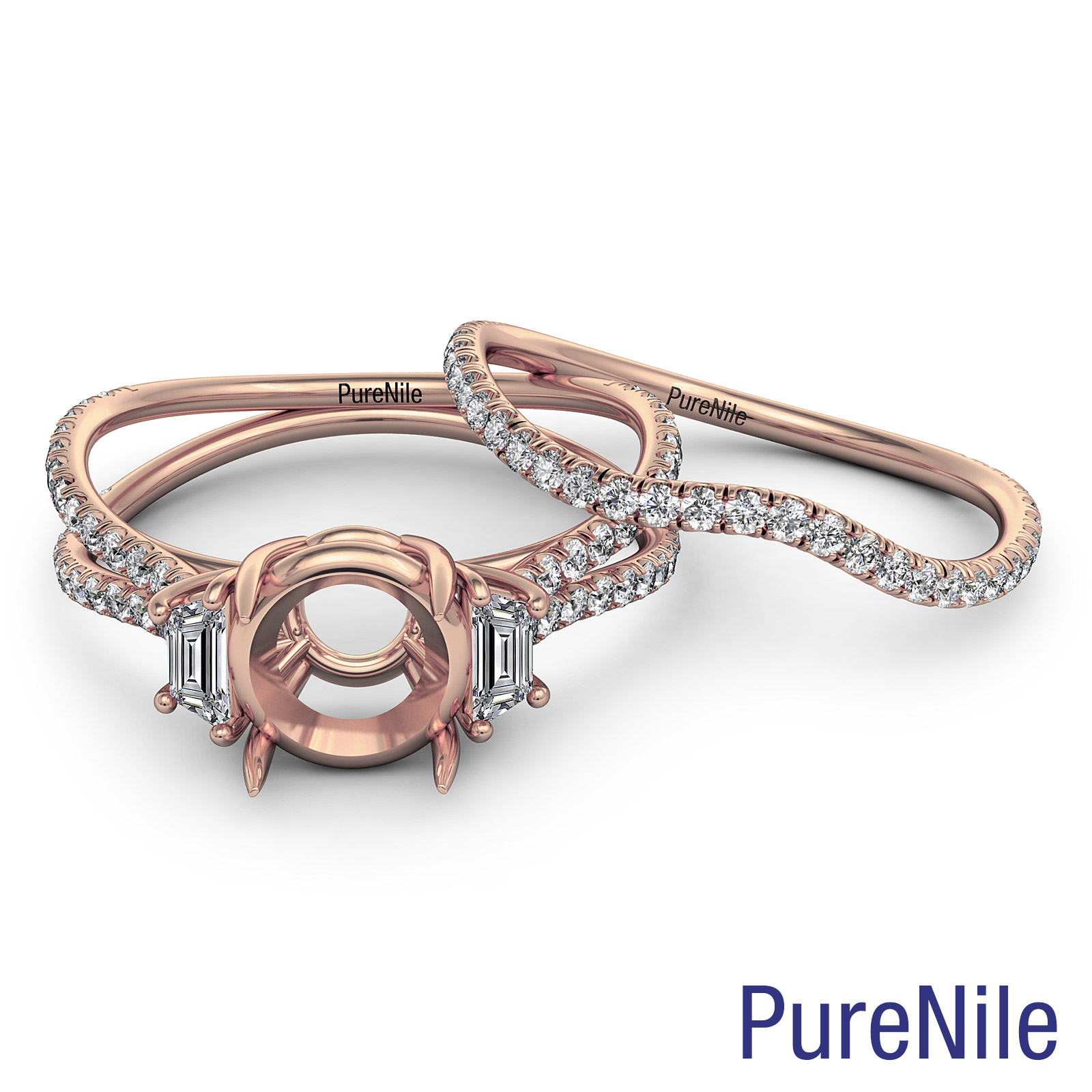 Stunning and unique three stone round semi mount bridal set diamond engagement ring expertly handcrafted in quality 14k Rose Gold. Features a beautiful split shank and wedding band with diamonds in a french U split pave and
