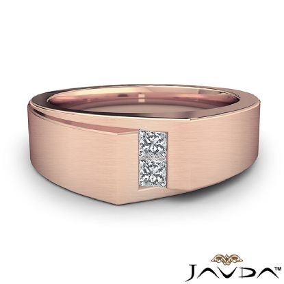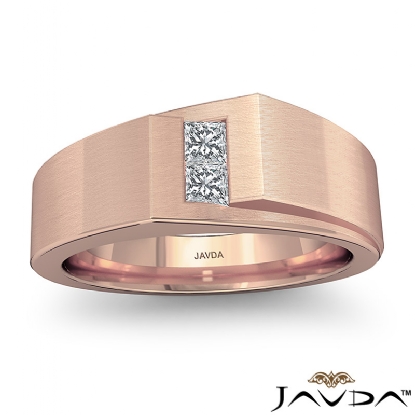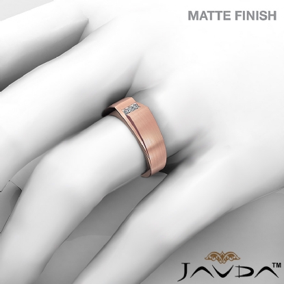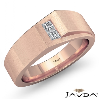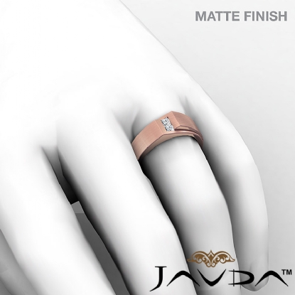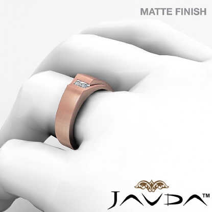 A beautiful pointed matte finish diamond men's half wedding band is made from solid 14k Rose Gold. Showcasing matte finish band with princess diamonds set in a channel setting.