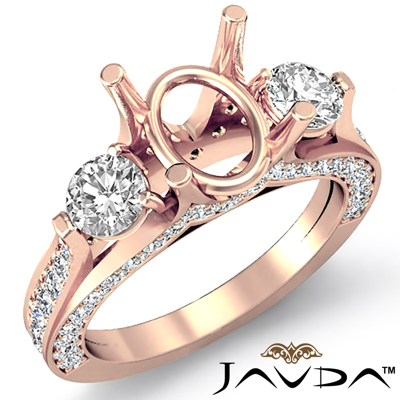 Gorgeous! This three-stone 14k Rose Gold, semi mount engagement ring triples the shimmer with side diamonds intensifying the oval center diamond, with smaller