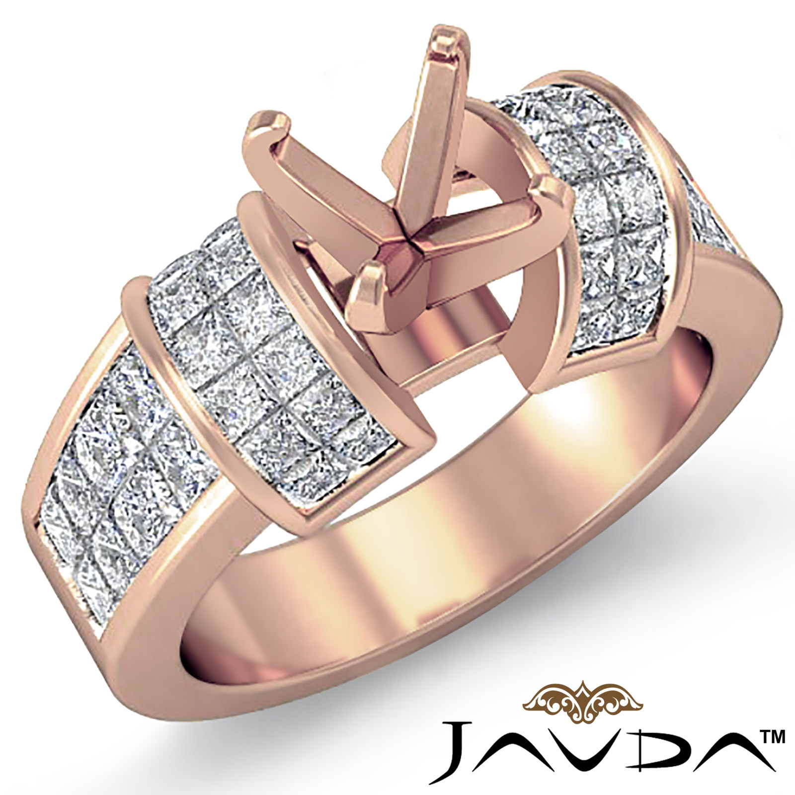 Alluring in every way, this classic polished finish ring is made in 18k Rose Gold. It features a round semi mount, with princess cut diamonds in invisible setting shimmering along the shank. (1.96Ct. tw.)