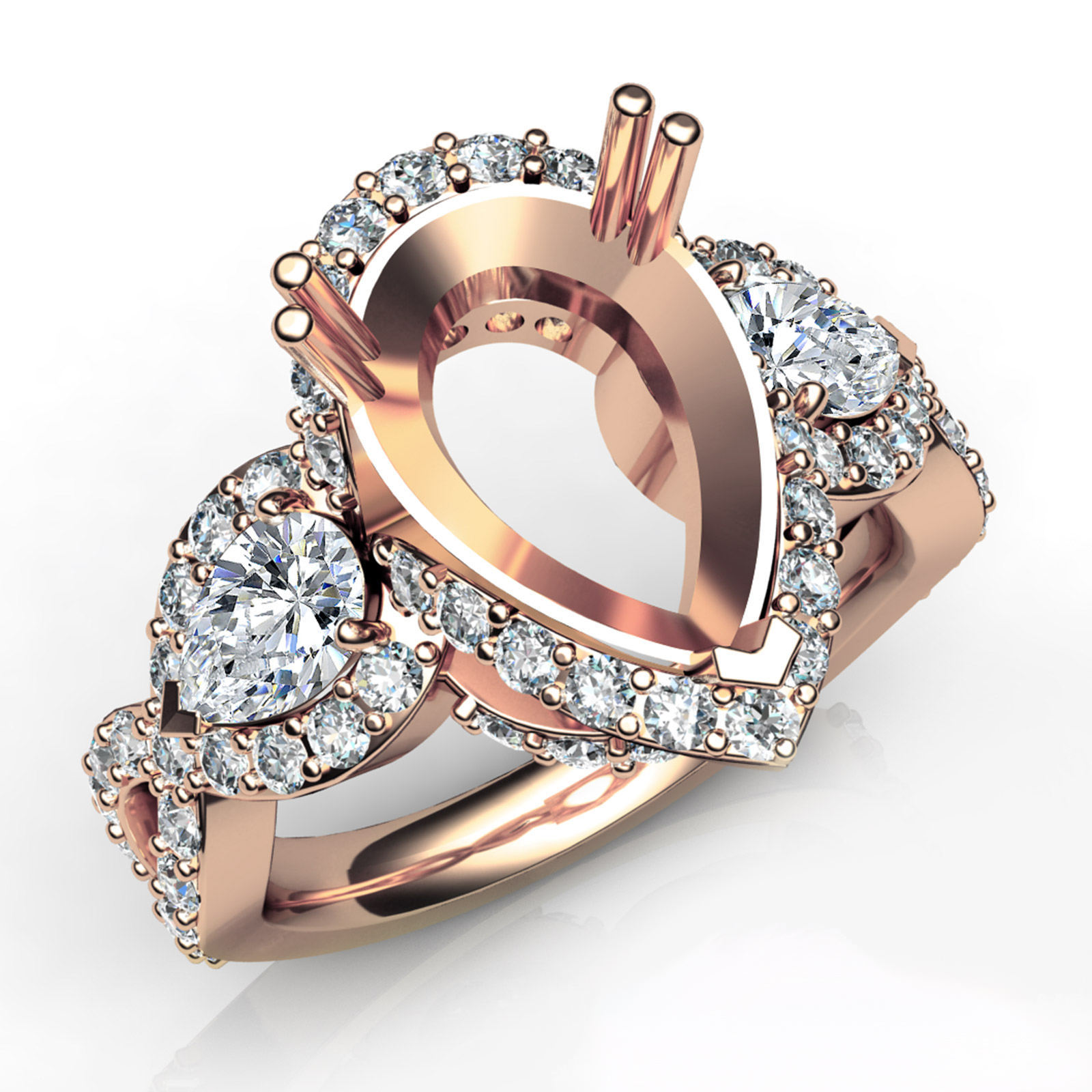 This semi mount blooming beauty features three pear shaped stones for a glamorous engagement ring. of round diamonds along the halo & shank, surround the