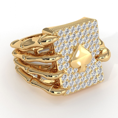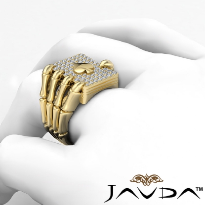This uniquely hip hop style skull hand claw poker playing card mens diamond ring crafted in solid 14k Gold Yellow. Features sparkling brilliant round cut diamonds in a micro pave setting. Available in 14k and 18k white gold, yellow gold, rose gold and platinum 950. (0.8Ct. tw.)