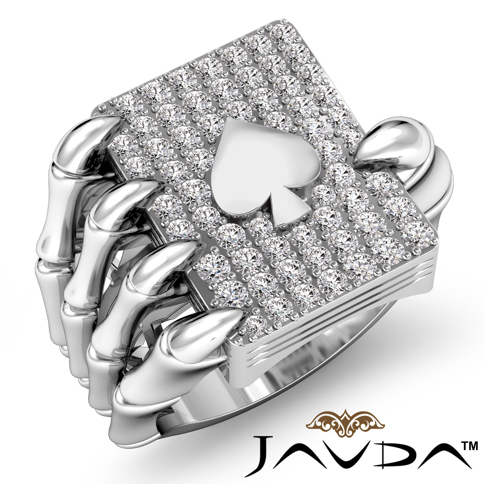 This uniquely hip hop style skull hand claw poker playing card mens diamond ring crafted in solid Platinum 950. Features sparkling brilliant round cut diamonds in a micro pave setting. Available in 14k and 18k white gold, yellow gold, rose gold and platinum 950. (0.8Ct. tw.)