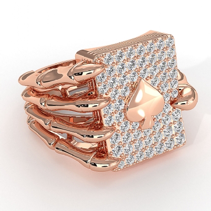 This uniquely hip hop style skull hand claw poker playing card mens diamond ring crafted in solid 14k Rose Gold. Features sparkling brilliant round cut diamonds in a micro pave setting. Available in 14k and 18k white gold, yellow gold, rose gold and platinum 950. (0.8Ct. tw.)