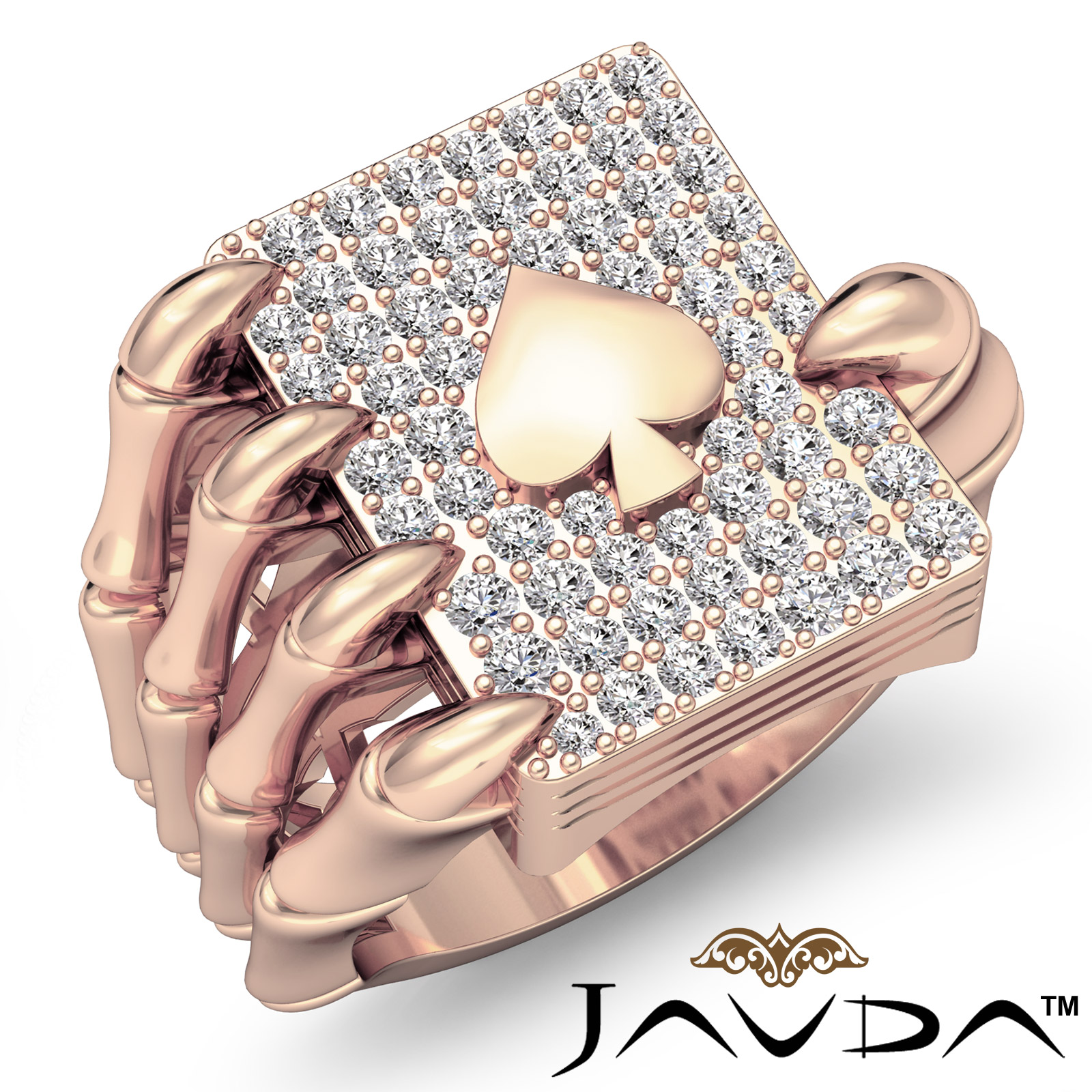 This uniquely hip hop style skull hand claw poker playing card mens diamond ring crafted in solid 18k Rose Gold. Features sparkling brilliant round cut diamonds in a micro pave setting. Available in 14k and 18k white gold, yellow gold, rose gold and platinum 950. (0.8Ct. tw.)
