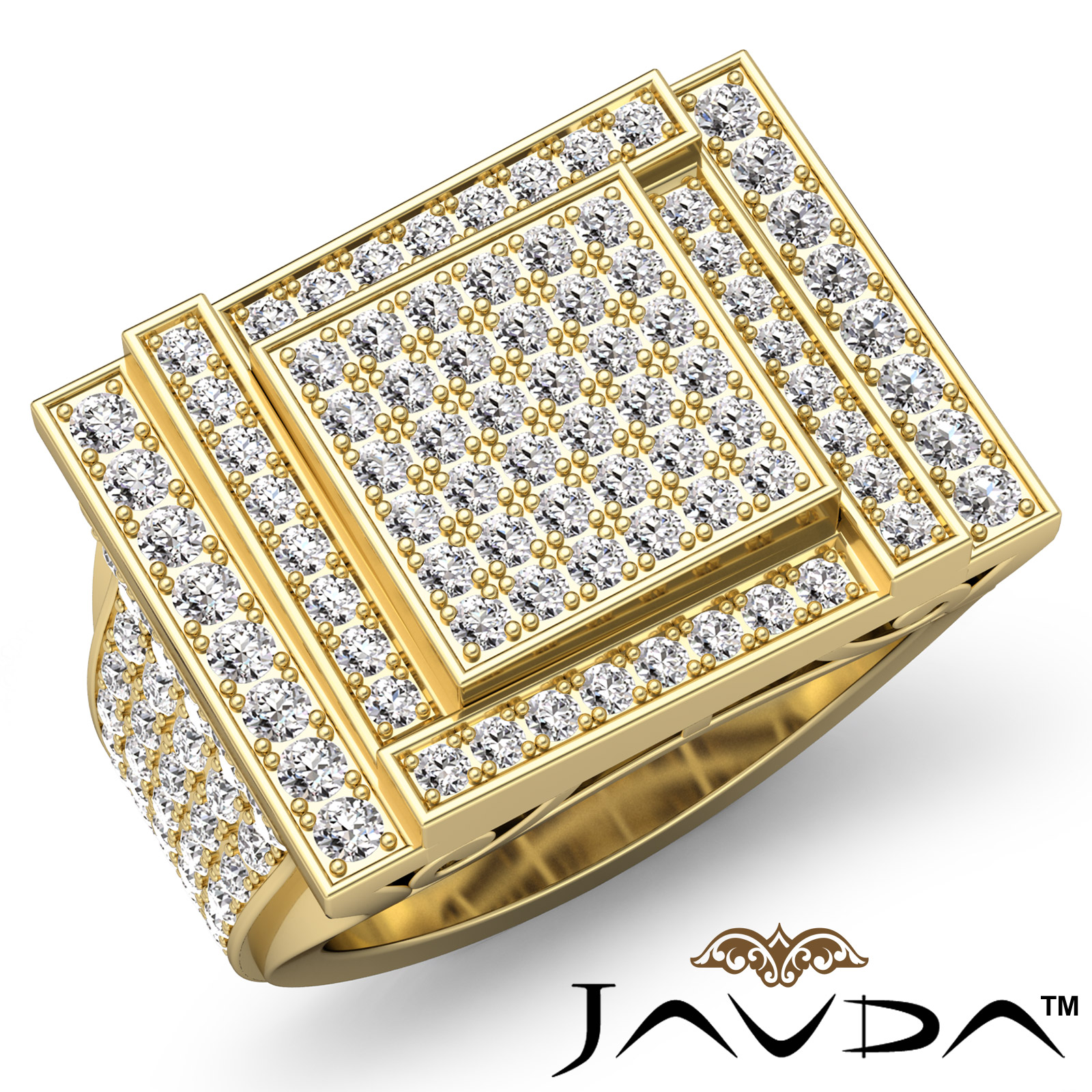 Luxurious hip hop style heavy mens diamond ring crafted in polished finished solid 14k Gold Yellow. This handsome diamond ring features dazzling round cut diamonds in a micro pave setting with beautiful filigree on bridge. Available in 14k and 18k white gold, yellow gold, rose gold and platinum 950. (2.12Ct. tw.)