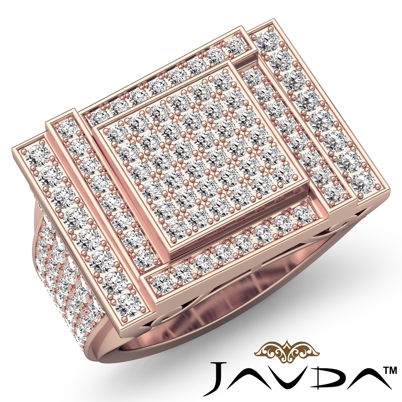 Luxurious hip hop style heavy mens diamond ring crafted in polished finished solid 18k Rose Gold. This handsome diamond ring features dazzling round cut diamonds in a micro pave setting with beautiful filigree on bridge. Available in 14k and 18k white gold, yellow gold, rose gold and platinum 950. (2.12Ct. tw.)