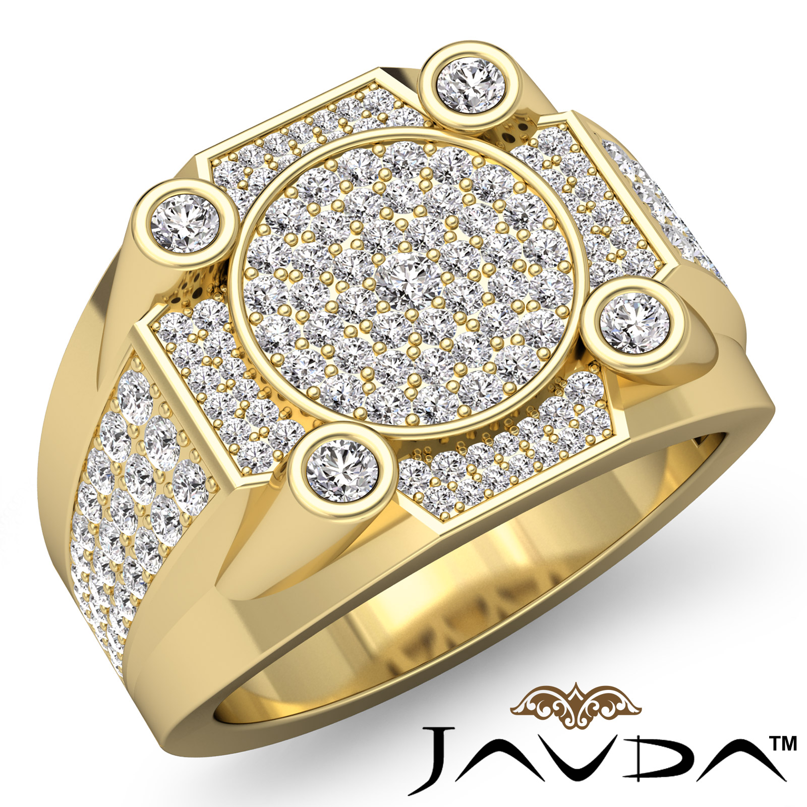 Luxurious touch of custom made designer hip hop cluster diamond ring for men is skillfully crafted in 14k Gold Yellow. This handsome mens diamond ring showcases diamonds in highly polished finish micro pave setting. Accent diamond in a bezel setting give this ring a modern look. Available in 14k and 18k white gold, yellow gold, rose gold and platinum 950. (1.2Ct. tw.)