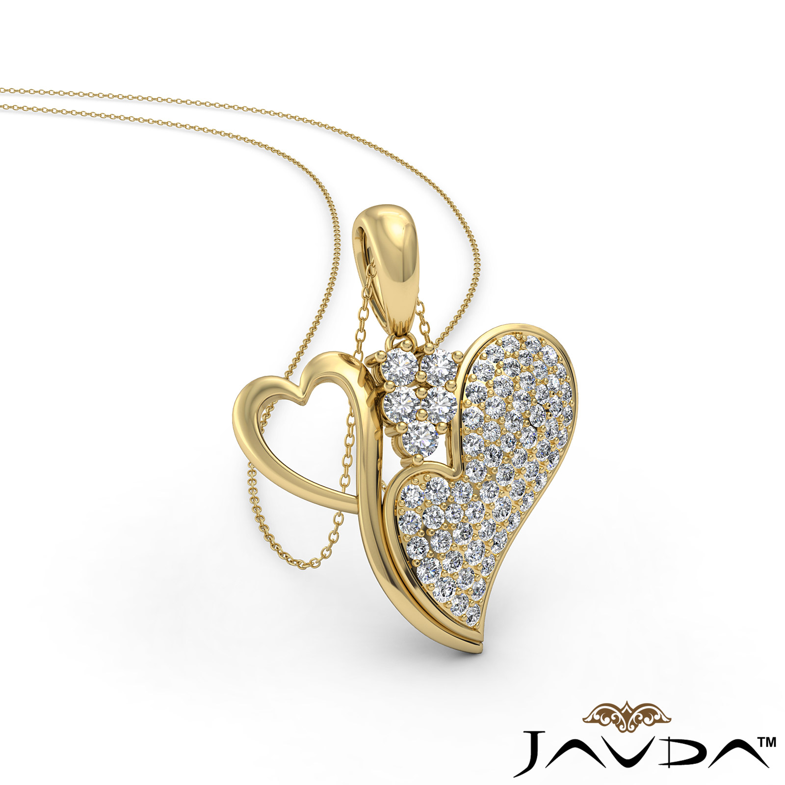 Double your love with double heart pendant necklace made from 14k Gold Yellow. This artful pendant showcases polished finish heart holding another heart with round diamonds set in micro pave setting with a beautiful secure bail holding chain with pendant.