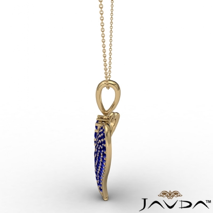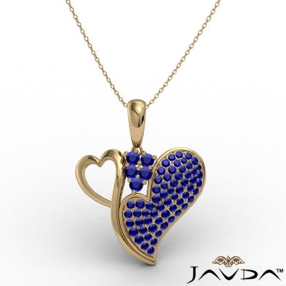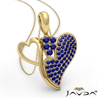 Double your love with double heart pendant necklace made from 18k Gold Yellow. This artful pendant showcases polished finish heart holding another heart with round sapphire gemstone set in micro pave setting with a beautiful secure bail holding chain with pendant.