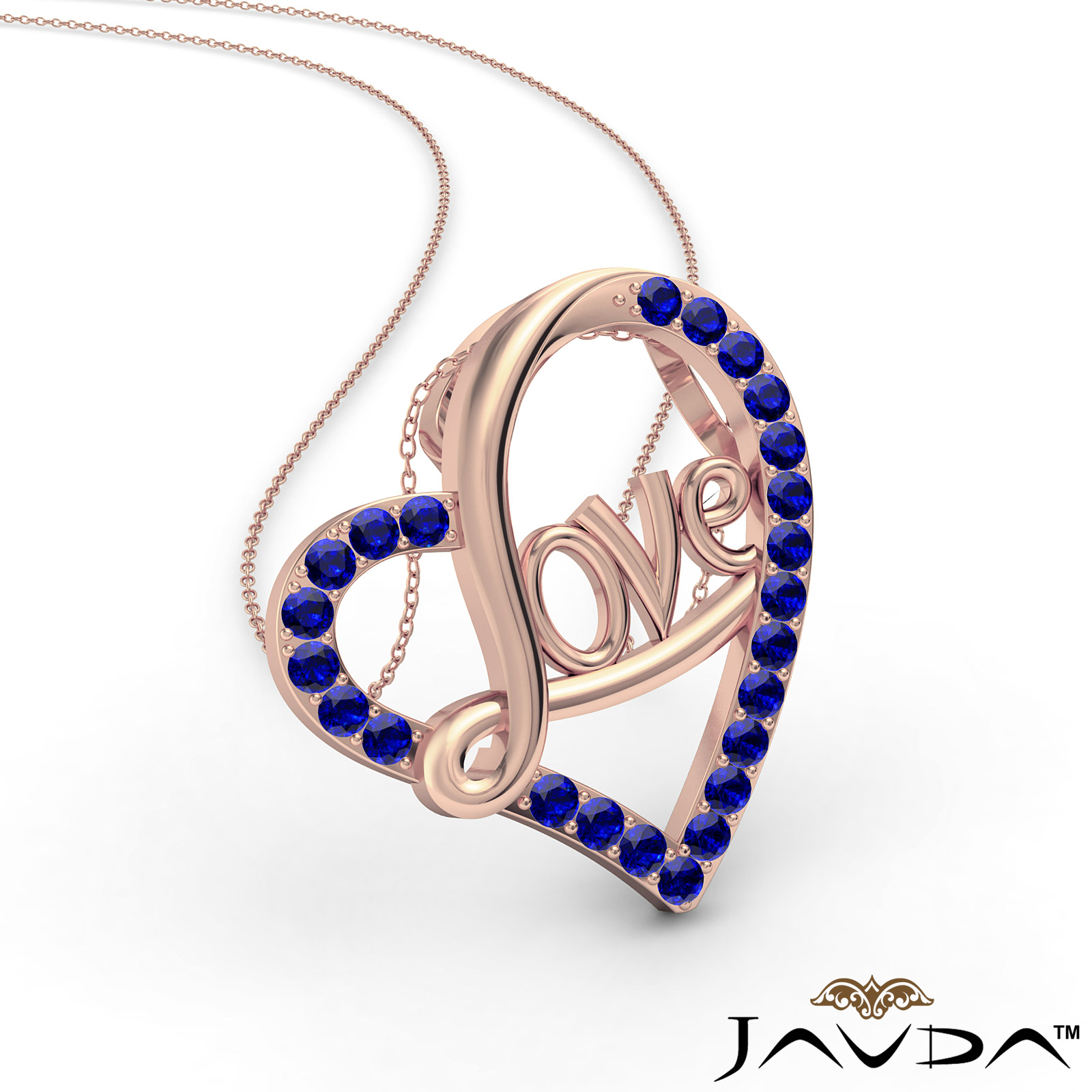 A charm Love script heart pendant necklace accented with tiny round shape diamonds on heart crafted in 14k Rose Gold. Sparkling round sapphire gemstone are elegantly set in micro pave setting, available in 14k, 18k white, yellow, rose gold and platinum 950.