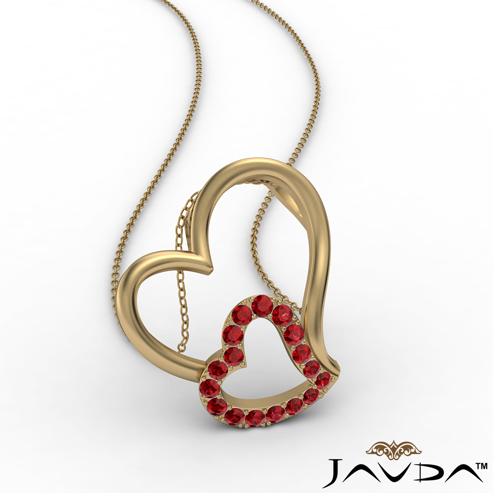 Delicate accent double heart pendant necklace made in 18k Gold Yellow. This romantic style pendant features a polished heart holding to another heart with ruby gemstone set in a micro pave setting.
