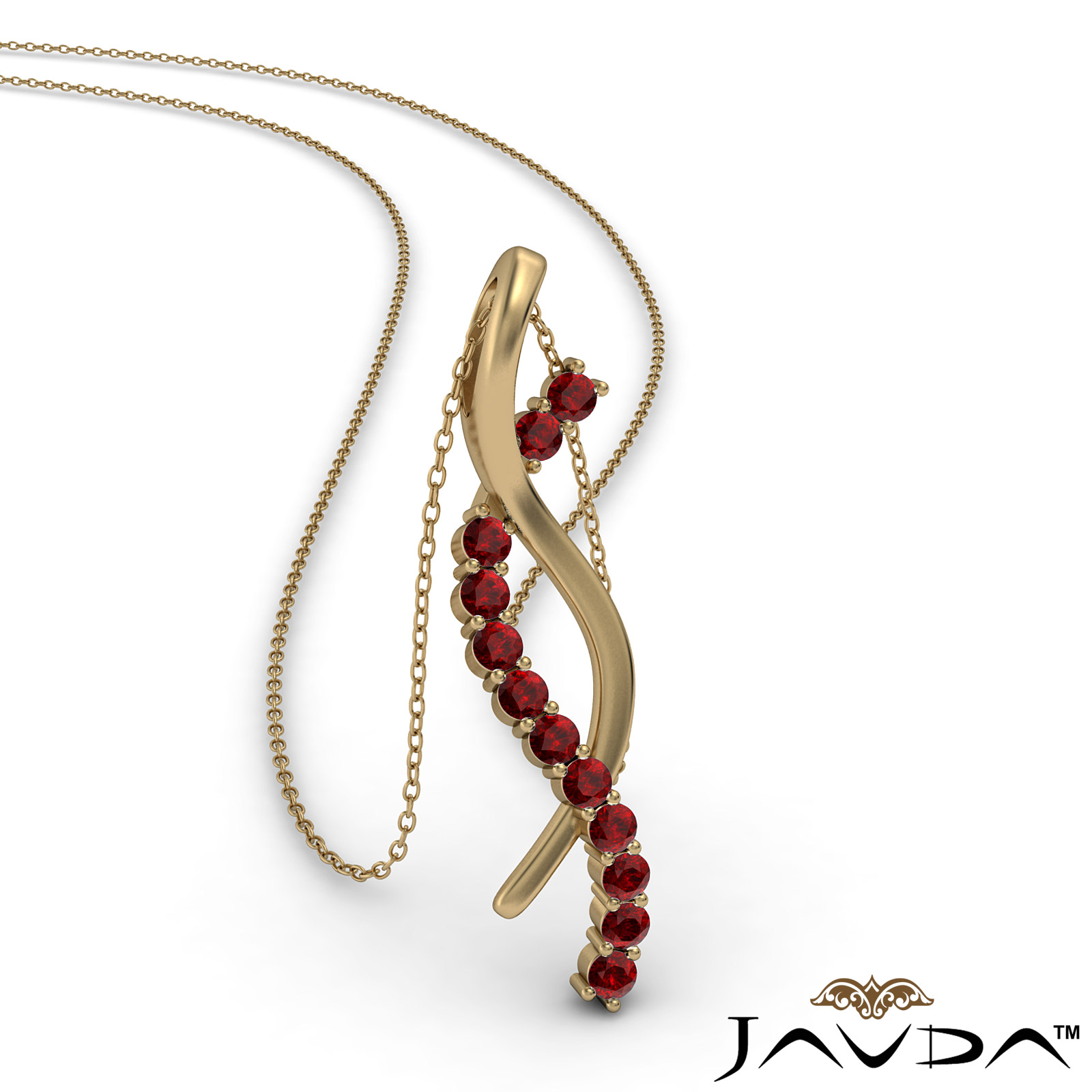 A stunning twisted ribbon ruby gemstone pendant necklace made in 18k Gold Yellow. This striking pendant design features round ruby in a prong setting diamond lined ribbons twisting with polished ribbons.